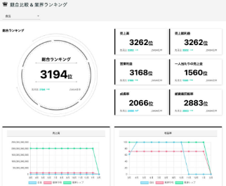 - 業界・業種ごとに細分化し、売上高や人件費等を他社と比較。さらに業界内の順位を各指標で表示。